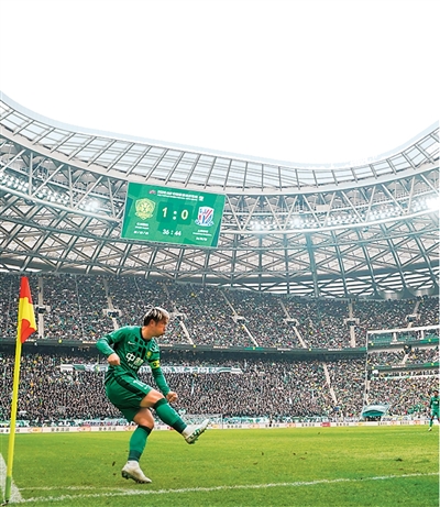 北京国安队球员张稀哲在比赛中发角球。新华社记者 那宇奇 摄